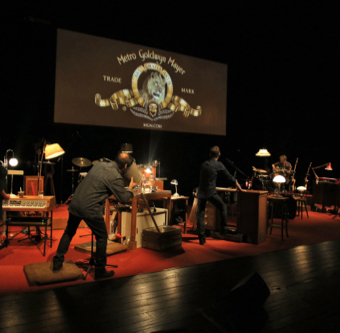 Sur le plateau, un amoncellement d’objets, de caisses, de bouteilles, de bibelots de toute sorte et des instruments de musique font face à un classique écran de cinéma. Manipulés avec dextérité par trois comédiens et deux musiciens, tous ces éléments permettent de réaliser le bruitage, le doublage et la bande son, en live, des séquences cinématographiques qui défilent sur l’écran. Le Collectif Mensuel reprend la tradition du « mashup », une association de plusieurs plans de films différents, afin de produire en direct un « blockbuster » inédit et parodique, réalisé à partir de 1400 plans-séquences puisés dans 160 films hollywoodiens. La performance tient dans le fait que les cinq acteurs sur scène suivent le déroulement des scènes et prêtent leur voix à des dizaines d’acteurs hollywoodiens – dont Julia Roberts, Sean Pean, Brad Pitt, Sylvester Stalone, Michael Douglas, Judi Dench, Tom Cruise –, pour reproduire l’effet de fascination caractéristique du cinéma : on a beau savoir que le son est produit sur le plateau, on a l’irrésistible sentiment qu’il provient de l’image.