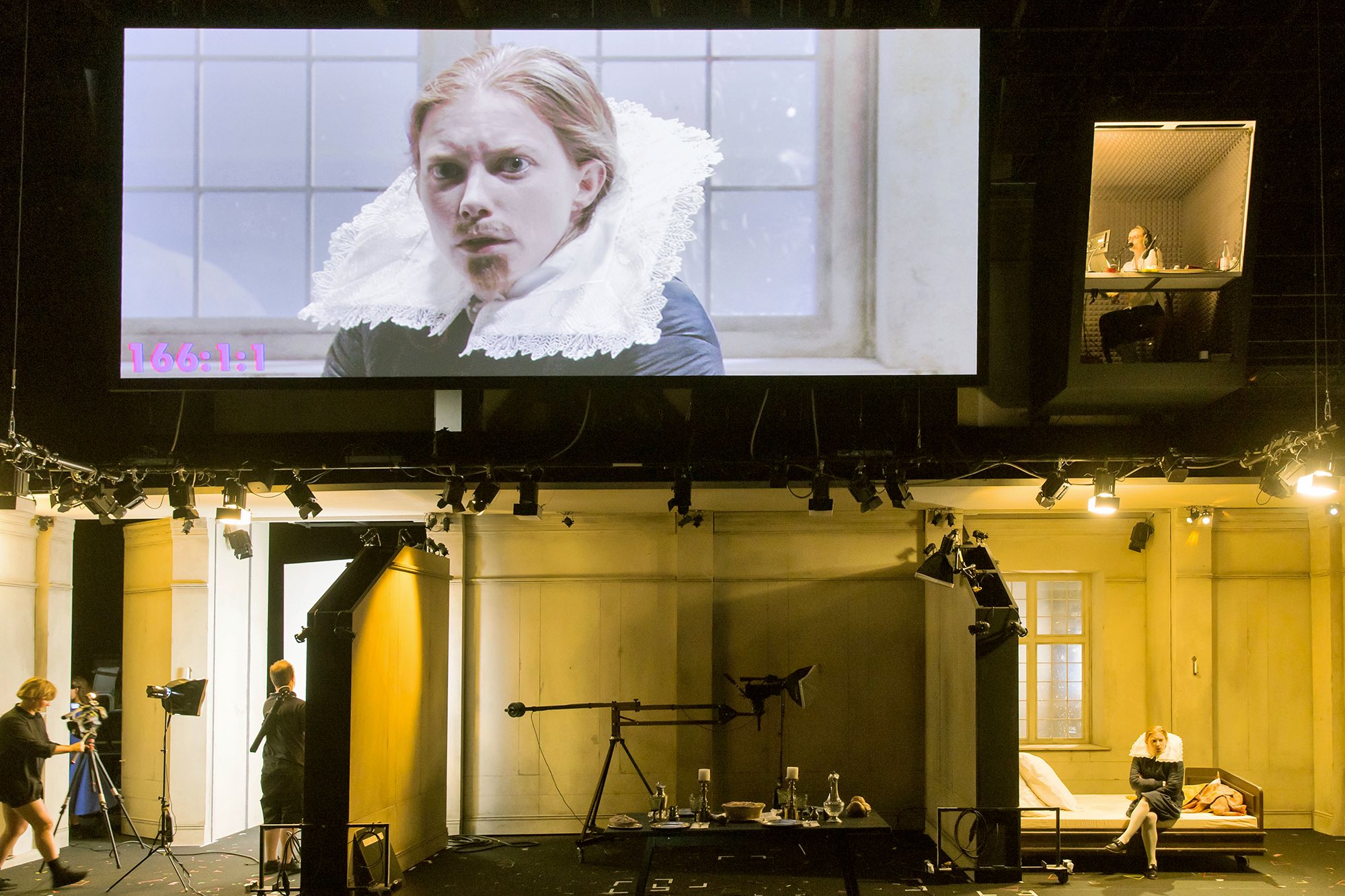Il faut du temps, une fois les lumières éteintes, pour que le spectateur reprenne souffle et esprits. Au fil de ce spectacle où Katie Mitchell met en scène le célèbre roman de Virginia Woolf, on suit Orlando dans une course folle, condensée dans les deux petites heures que nous passons en sa compagnie. Physiquement présent sur les planches, il apparaît aussi sur un écran qui diffuse des images tantôt en direct, tantôt prises hors scène – des images qui nous permettent de suivre les tribulations du personnage à travers les époques, du XVIe au XXe siècle, et à travers plusieurs lieux emblématiques : forêts britanniques, châteaux, voyages en Orient… Abolissant toute segmentation temporelle, la mise en scène nous montre même le héros au volant d’une voiture de notre époque, amenant l’intrigue dans un temps qui dépasse de loin celui de l’auteur et de l’écriture du roman, achevé en 1928. Orlando, qui se présente d’abord comme un jeune courtisan, favori de la reine Élisabeth, multiplie les aventures amoureuses et sexuelles avec toutes les femmes qu’il rencontre, sur scène comme à l’écran, et apparaît donc comme un puissant séducteur, n’ayant pour seul talent que sa plume. Tout bascule au XVIIIe siècle lorsque, après un long sommeil, Orlando se réveille femme.