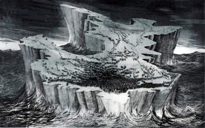 Great Lost Party Adrift (1971), où une armée de silhouettes humaines encerclée par la mer du Labrador, au large du Canada, se trouve à la merci d'une gigantesque masse de glace qui s'est détachée du continent, voguant sur l'eau, léchée par les vagues. Chez Blackwood, la glace est rarement blanche, car souvent de mauvaise augure. Elle flotte entre le gris, le bleu marine et le noir, et retient les reflets lumineux autant qu'elle emprisonne ses victimes.