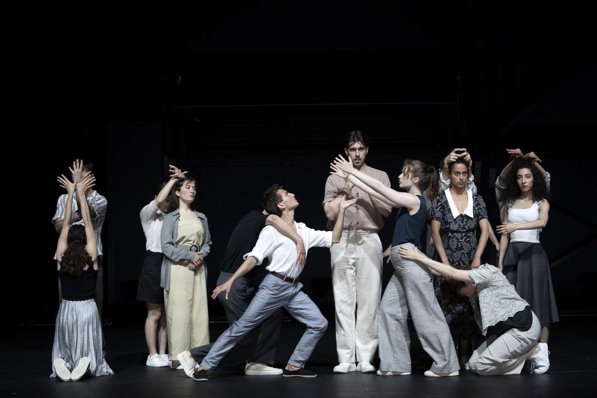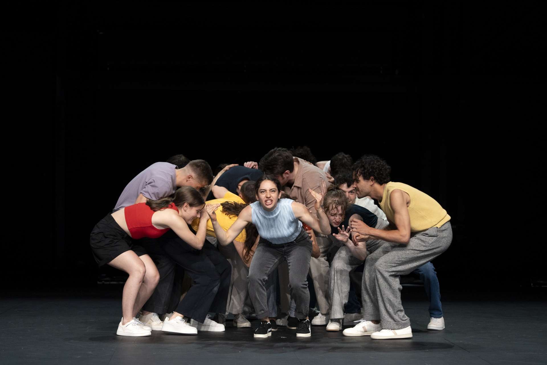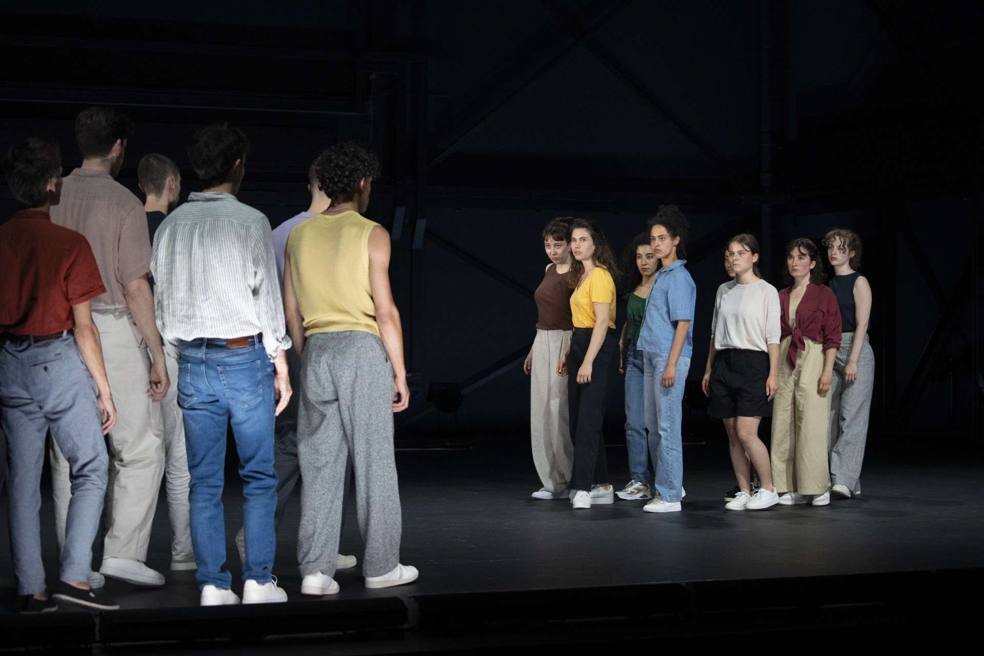 EN 2020, FANNY DE CHAILLÉ CRÉAIT LE CHŒUR AVEC DIX jeunes comédiens, à l’aube de leur parcours d’actrices et d’acteurs. En 2022, la directrice du TnBA créait, avec quatre comédiens de ce même groupe, Une autre histoire du théâtre, (pour lire notre article, c’est ici). Et en 2024, elle a eu envie de continuer à travailler de la même façon pour élaborer une pièce dont les enjeux se situent entre la transmission et la création. Lors des séances de travail, la metteuse en scène a « senti beaucoup de dissensions au sein [du] groupe, tout chez eux faisait débat, l’école de théâtre avait fait son œuvre et cette citation de Vilar trouvait son sens pour [elle] : ‘’Attention, le théâtre n’est pas là uniquement pour rassembler, il est aussi là, et surtout là, pour diviser, pour ouvrir une réflexion et un débat’’. » De là est né le dernier spectacle de sa « trilogie », Avignon, une école.